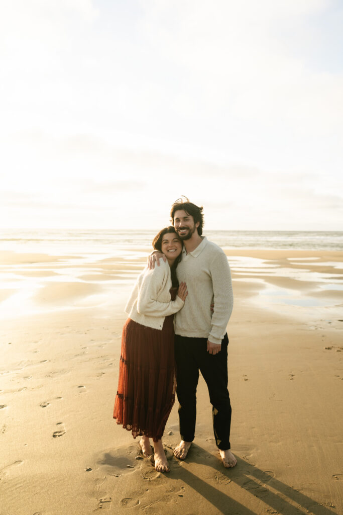 Another major factor with Northern California Coast Engagement Photos is timing and weather. Coastal light often changes. I build sessions around golden hour and track marine layers closely, as well as high tide. I like to joke that I have a sunshine streak going, and this session was no different. Soft light reflecting off the water gave us that clean, editorial finish without losing authenticity. Planning around light is one of the biggest differences between average beach photos and elevated, intentional ones.